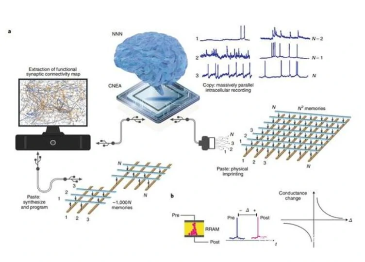 论文还进一步提出了一种将神经元布线图快速粘贴到记忆内存网络上的方法策略。当由细胞内记录的信号直接驱动时,一个专门设计的非挥发性内存网络可以学习和表达神经元网络连接图。这是一个直接将大脑的神经元网络连接图下载到记忆内存芯片上的方案。