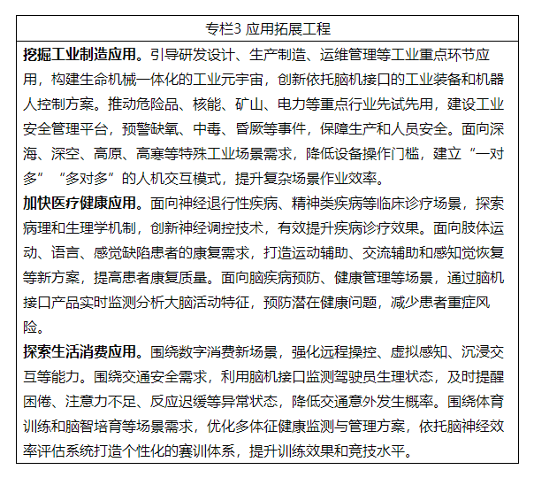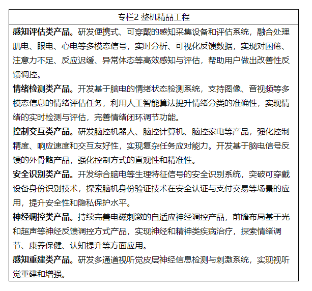 到2027年,脑机接口关键技术取得突破,初步建立先进的技术体系、产业体系和标准体系。电极、芯片和整机产品性能达到国际先进水平,脑机接口产品在工业制造、医疗健康、生活消费等加快应用。产业规模不断壮大,打造2至3个产业发展集聚区,开拓一批新场景、新模式、新业态。