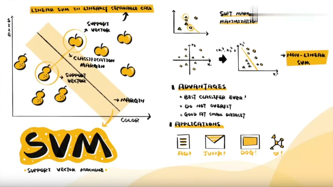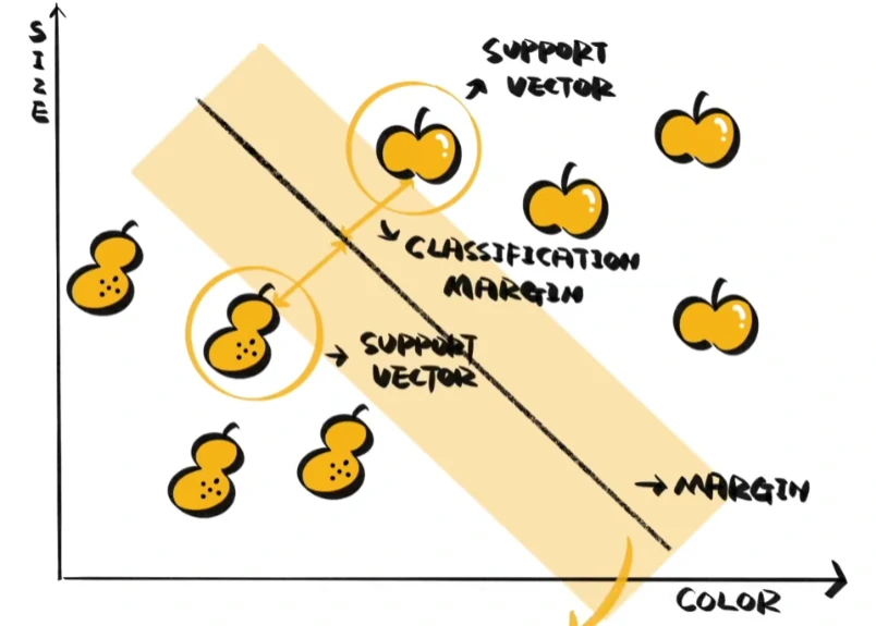 不必计算所有的距离,只要找到线附近的样本,让它们与线的距离越远越好,这个距离被称为分类间隔,决定了线的样本被称为支持向量,这也是支持向量机名字的由来。