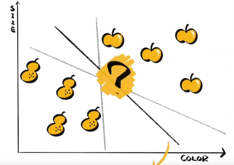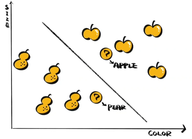 画条线好像也不错,通过将两者所在的空间作出区分,当新样本落在苹果一侧时,我们就认为它是苹果,反之就认为它是梨。