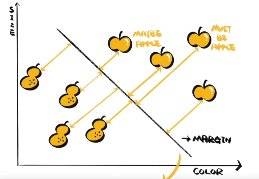 哪条线才是最合适的呢?其实除了界限,样本与线的距离同样有意义,它代表着样本分类的可信程度。以苹果这一侧为例:与线的距离最远的苹果,是苹果的可能性最高;离得越近,是苹果的可能性就越低。我们的目标是在两种样本间,找到能让所有样本的分类可信程度最高的那条线。