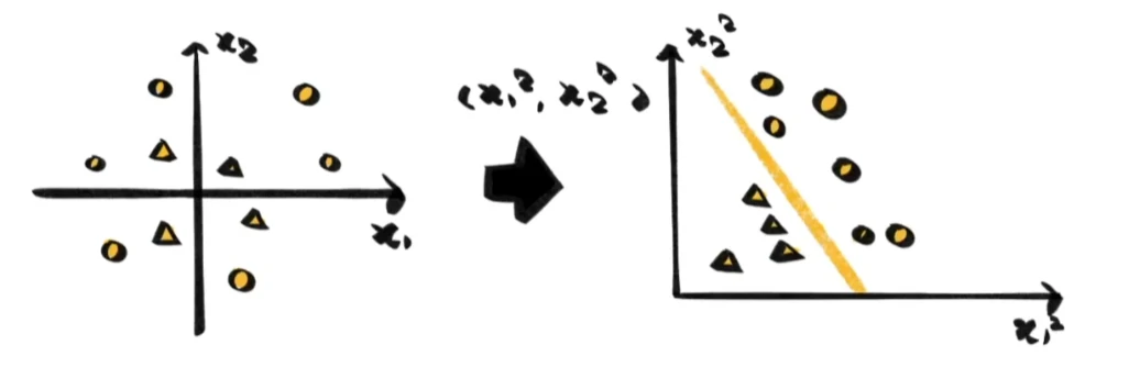 那就通过一定的变换,将它们映射到一个能用直线区分的空间,再寻找分类线。