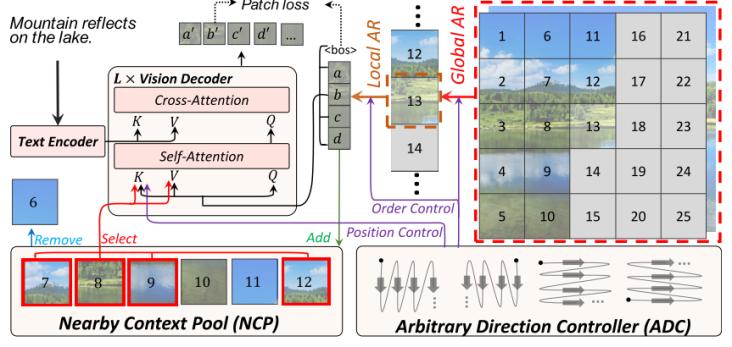 微软亚洲研究院研究员段楠说,“NUWA-Infinity从底层形成了一套全局自回归的生成机制,不仅可以对图片进行延展式的生成,也可以应用于视频预测创作,而这也是我们接下来要攻克的研究课题。”通过全局自回归建模视觉块之间的依赖关系和局部自回归建模视觉词之间的依赖关系,让NUWA-Infinity能够生成全局一致且局部细节丰富的高质量图像和视频。同时提出任意方向控制器(Arbitrary Direction Controller, ADC)来决定合适的生成顺序并学习顺序感知的位置嵌入。此外,模型还引入附近上下文池(Nearby Context Pool, NCP)进行局部生成图像的缓存。