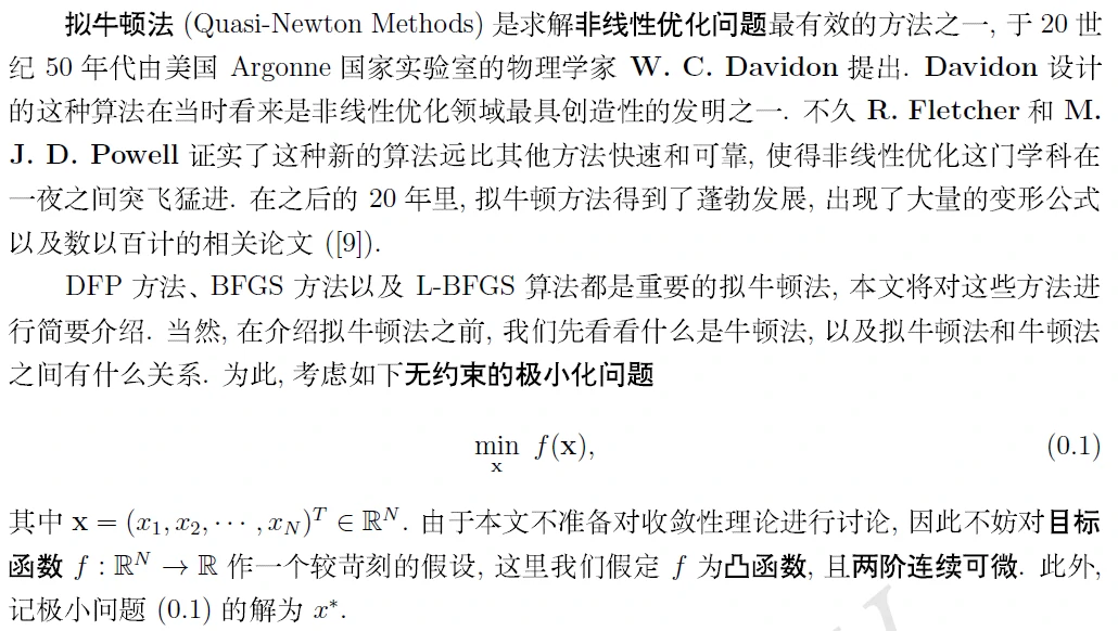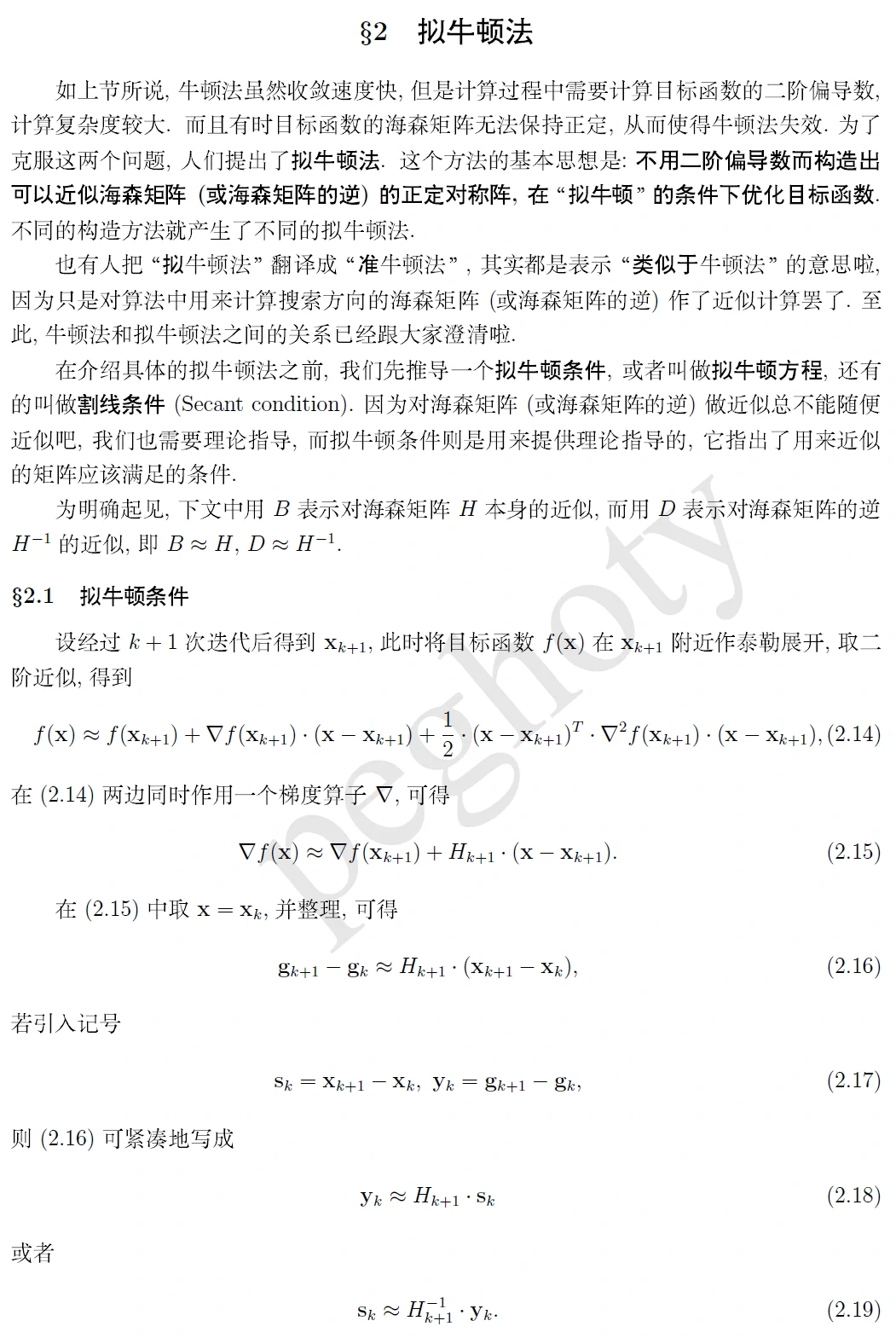 牛顿法中的Hesse矩阵HH在稠密时求逆计算量大,也有可能没有逆(Hesse矩阵非正定)。拟牛顿法提出,用不含二阶导数的矩阵 U_t 替代牛顿法中的 H^-1_t,然后沿搜索方向 −U_t g_t 做一维搜索。根据不同的 U_t 构造方法有不同的拟牛顿法。