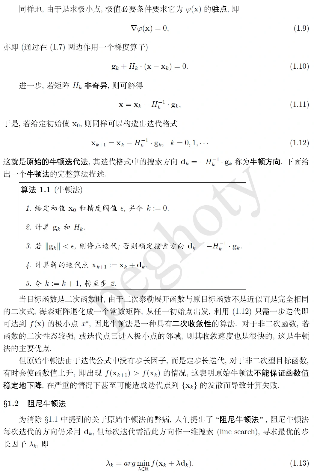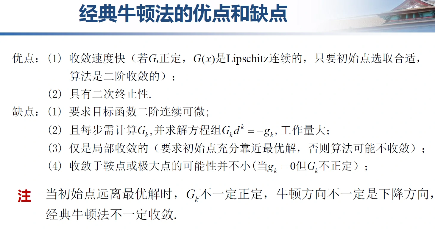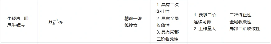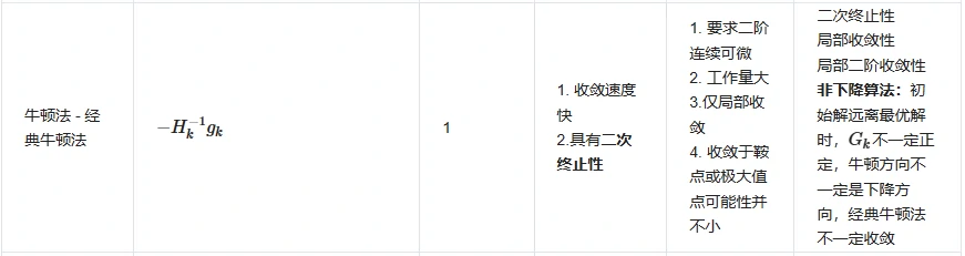 Newton法利用了二阶梯度,收敛速度快,但是目标函数的Hesse矩阵不一定正定。于是出现了修正的Newton法,主要是对不同情况进行了分情况讨论。Newton法的优缺点都很突出。优点:高收敛速度(二阶收敛);缺点:对初始点、目标函数要求高,计算量、存储量大(需要计算、存储Hesse矩阵及其逆)。