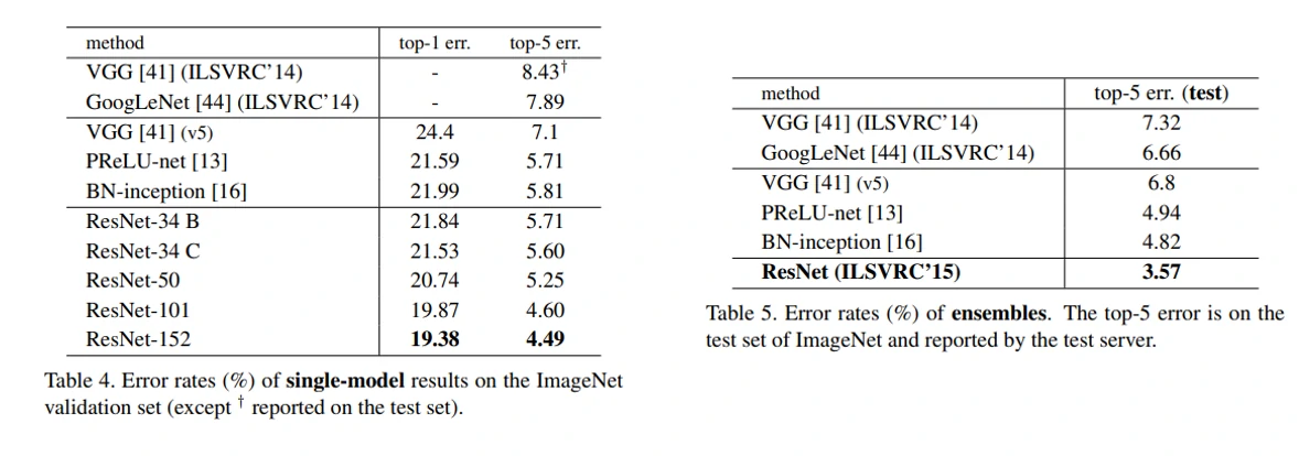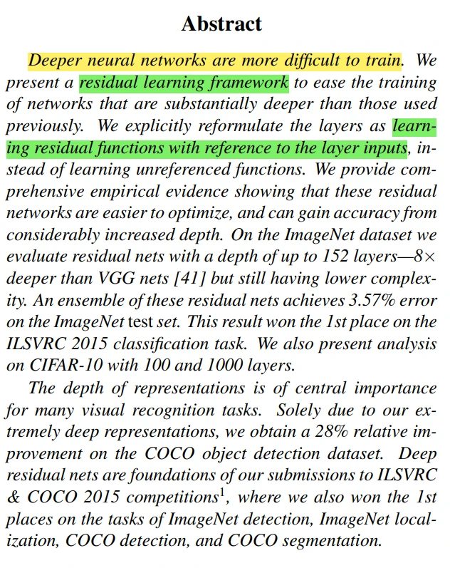 - 4-7句为在ImageNet上的比赛结果,论文设计的152层网络取得了3.57%的错误率,获得了比赛第一名。
