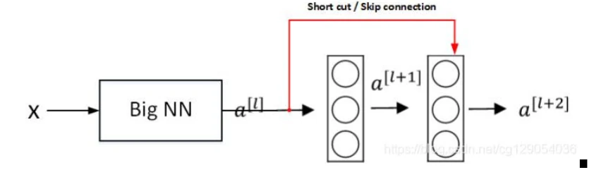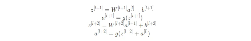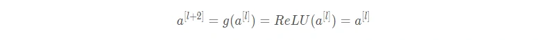假设有一个很大的神经网络,其输入为X,输出为a[l]。为这个神经网络再添加残差块,输出为a[l+2]。假设整个网络中都选用 ReLU 作为激活函数,因此输出的所有激活值都大于等于0。a[l]与a[l+2]之间的函数关系为: