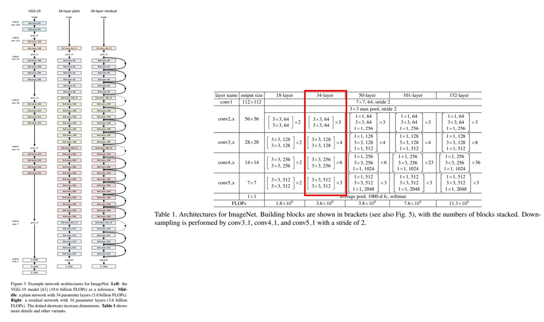 最后是全局平均池化层和具有softmax的1000维度的全连接层,这样整个网络包含 1 + 1 + (3 + 4 + 6 + 3) × 2 = 34 个卷积层。尽管网络深度相比VGG-19要深了许多,但是FLOPs只是VGG-19的18%左右。