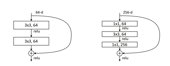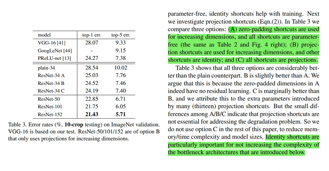 从表1可以看到,ResNet-18和ResNet-34具有相同的残差连接块,每个连接块包含两个卷积层。而ResNet-50/101/152的每个连接块包含3个卷积层。作者把这种连接块称为bottleneck,这里主要使用了1 × 1的卷积核,主要是用于匹配特征图维度以及从实践出发能够承担的起训练时间。(之前听过论文通信作者的一个报告,据说这个网络训练时间为一个月,具体一个月是指纯训练还是指训练+测试+调参就不太清楚了)。