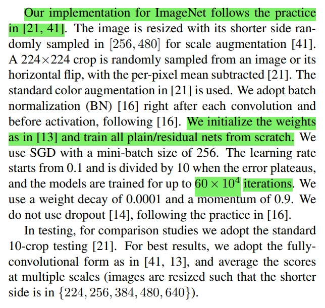 作者是参考AlexNet和VGG来进行训练。首先对图像的短边进行尺度扩大,扩大到[256, 480],然后和AlexNet一样,随机选择 224 × 224 大小的图案。作者在这里使用到了batch normalization(BN)技术;然后作者按照自己的另一篇文章来进行初始化并从零开始训练(如果对作者之前工作不了解的话还要再去看作者的文章了解如何对网络初始化,对第一次看到这篇文章的读者来说增加了阅读难度,不过作者可能也是因为受到篇幅影响,不想再过多介绍)。梯度下降使用了SGD,mini-batch大小为256,总共进行了 60 × 10^4 次迭代(目前很少有这样的写法了,都是介绍训练了多少个epochs)。为了得到最好的实验结果,作者在多个尺度上进行评估,然后取平均分。