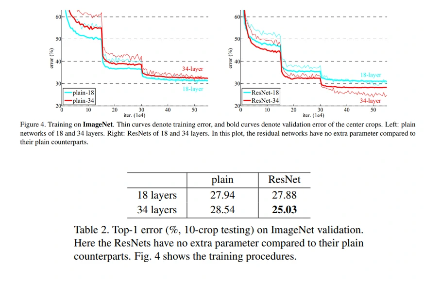 从论文中可以看到作者做了大量实验。首先是ImageNet Classification,首先评估了plain-18/34两个网络,从表2可以看到,plain-34网络比plain-18有更高的错误率,从图4左图也可以看到,在训练过程中,出现了退化现象,随着网络深度的增加,训练误差反而变大。作者在论文中解释到:退化现象应该不是梯度消失引起的,因为整个训练使用了BN来训练,也查验了反向传播时梯度幅值也是正常的,作者怀疑可能是因为更深的网络有着更低的收敛速度,影响着训练误差的减小,这个问题未来会进一步研究。