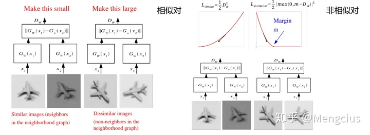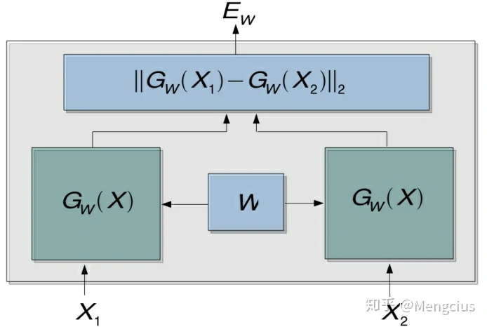 - 传统的siamese network使用Contrastive Loss(对比损失)。当然损失函数还有其他选择,Softmax当然是一种好的选择,但不一定是最优选择,即使是在分类问题中。下图是用了对比损失: