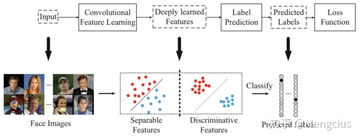 但对于人脸识别任务,深度学习的特征不仅需要separable,还需要判别性(discriminative) 。 可以泛化从而识别没有标签预测的未见类别。