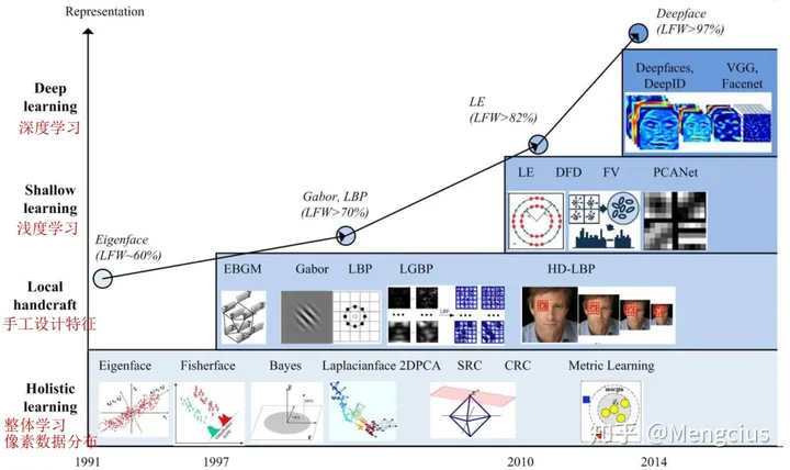 - 2014年,DeepFace和DeepID实现了最先进的精度,研究重点已转向基于深度学习的方法。