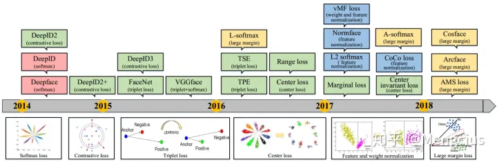 - 2014年的Deepface和DeepID标志着基于深度学习的FR诞生,用的是Softmax loss
