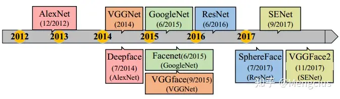 - 深度FR的体系结构始终遵循深度对象分类的网络结构,由AlexNet演化到SENet