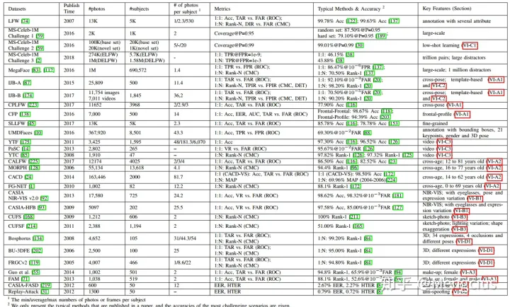 - 2007年引入LFW数据集,标志着无约束条件下FR的开始。从那时起,设计了更多具有不同任务和场景的测试数据库。