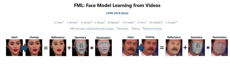 三维人脸重建就是建立人脸的三维模型,它相对于二维人脸图像多了一个维度,在电影和游戏等领域应用广泛。马克斯·普朗克计算机科学研究所与斯坦福大学的科研人员于2019年提出了一种新型的面部三维重建模型,最终得到的效果十分惊艳。该模型基于自监督学习,完全从零开始学习,使用了来自 YouTube 抓取的 6000 多个名人的视频片段进行训练;其将面部的多种特征分离再重新组合,结构化程度很高;且其能以任意帧数重建人脸面部,适用于单目和多帧重建。这项工作被CVPR2019接收,原文题目为FML: Face Model Learning from Videos。