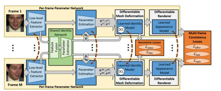 该研究提出了一种用于一致的多帧面部模型学习的新颖网络。它由M个暹罗塔组成,它们同时处理不同流中的M帧多帧图像。每个塔由一个编码器组成,该编码器估计帧特定于帧的参数和识别特征图。