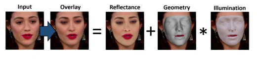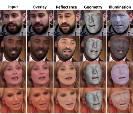三维人脸重建通过 in-the-wild 单目 2D 图像和视频数据处理分离的面部形状特征[1](中性几何)、皮肤外观(或反照率)和表情,以及估计场景照明和相机参数。其中一些属性面部形状特征,例如反照率和光照。此外,场景灯光较差,深度模糊性,和由于面部头发、太阳镜和大幅头部旋转导致的阻塞使得 3D 面部重建变得复杂。