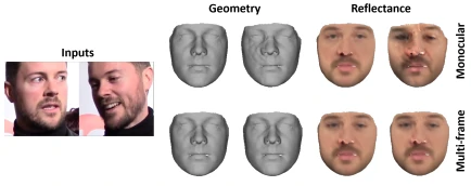 从技术角度来看,本研究的主要贡献之一是提出了一种确保面部身份和反照率重建在同一主体的框架中是一致的新的多帧一致性损失。通过这种方式,就可以避免在许多单目方法中存在的深度模糊,并获得一个更精确和稳健的面部几何和反照率模型。此外,通过在研究者们学习的面部识别模型和现有的混合形状表达模型之间施加正交性,该方法自动地将面部表情从基于身份的几何变化中分离出来,而不需要求助于大量手工制作的先验。