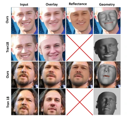 - 通过观察由研究者把面部分解成了反照率、三维几何形状和光照等特征,再进行组合重建得到了如上图8所示的最终合成结果overlay ,我发现重建后得到的人脸除了没有皱纹且面部五官较为模糊以外,五官特征和面部表情都和原人基本一致,且面部阴影效果也得到了高度还原。其中,五官模糊的部位主要在眼睛部分,重建后的人脸眼睛部位相当不清晰不仅缺少了双眼皮等特征,而且整个眼睛部位浑浊无神。