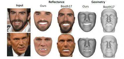 - 研究者把面部分解成了反照率、三维几何形状和光照这三个特征,再进行组合重建。通过图6和图9观察知该方法和其它现有方法的相比较,从图中的效果看来,除了用该方法得到的图片的还原度不高以外,其相对于其它方法相比可以更好地分离反照率、三维几何形状和光照这些不同的特征。同时,该模型合成的各种特征都能很好地贴合面部,不受侧面视角影响。