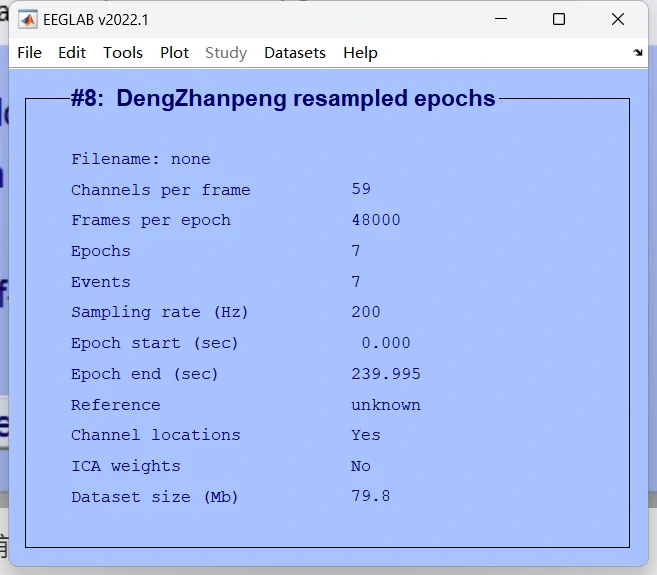 接下来弹出两个对话框,是否要对数据进行选择性导入和重命名,一般点击ok即可。导入数据后eeglab会显示数据信息。
