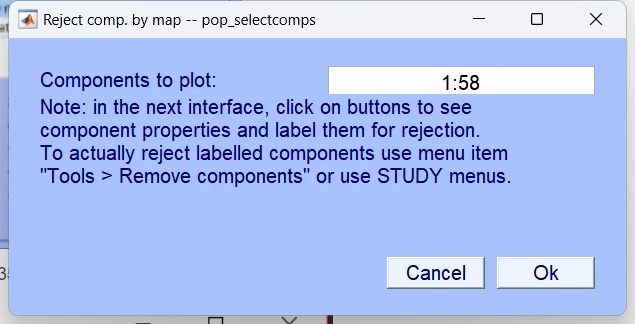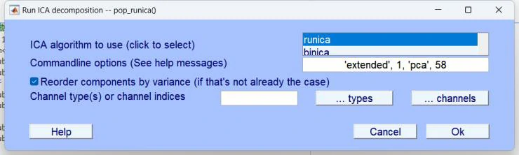 在上面的插值坏导步骤中我们删除了1个通道的数据,这1个坏通道的数据是用其他通道的数据生成的,相当于我们损失了1个有效通道数据,而ICA默认是在所有通道都是有效数据的情况下进行的,所以此处我们需要进行一些修改,在’extended’, 1后面加上’pca’, 58,中间用逗号和空格隔开,逗号要用英文输入法下的