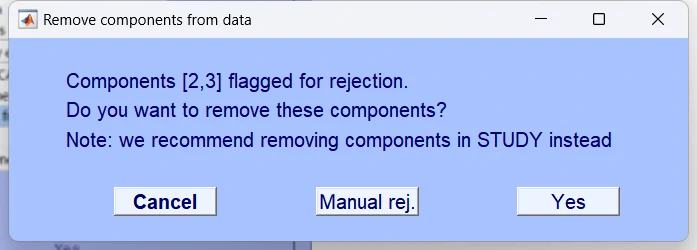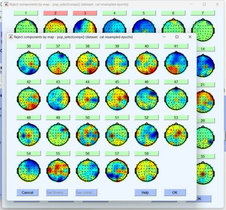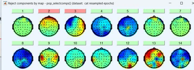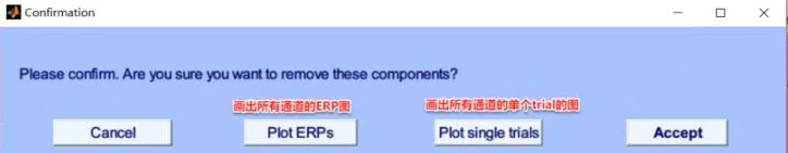 这一步需要对每一个成分进行查看和判断,然后将想要剔除的成分先标记起来。ICA可以进行眼电伪迹,肌电伪迹,坏导伪迹以及心电伪迹等的辨识与剔除,但是此处我们只进行眼电伪迹的剔除,我们将第2个成分和第3个成分标记起来,标记了的成分数会变成红色。然后点OK。此时还没有进行剔除操作。