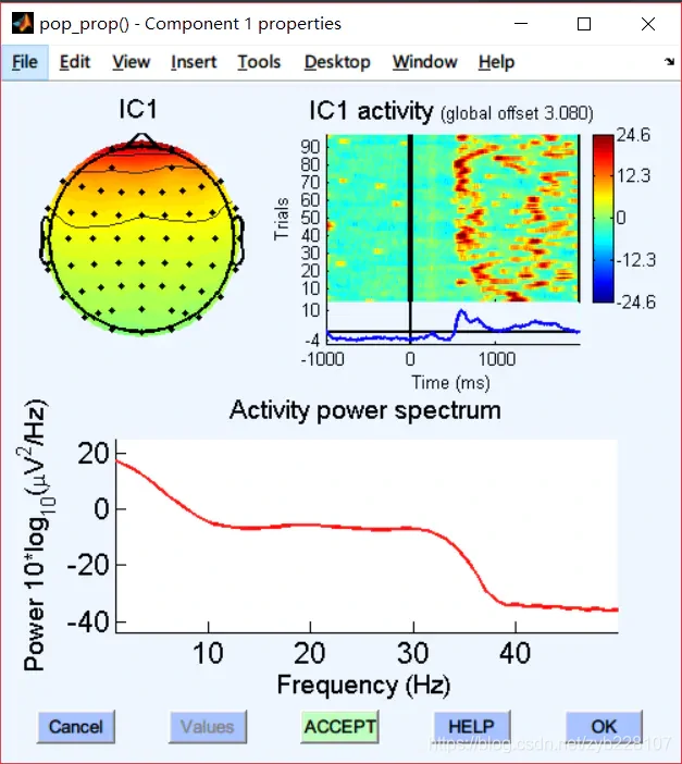 此时我们可以对所有的ICA成分进行查看和标记,点击成分数字,会出现该成分的详细情况。如果觉得该成分代表伪迹成分,想要剔除的话,可以先将它标记起来。标记的方式是单机下方绿色的ACCEPT,单击之后会变成红色的REJECT