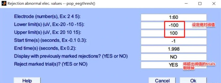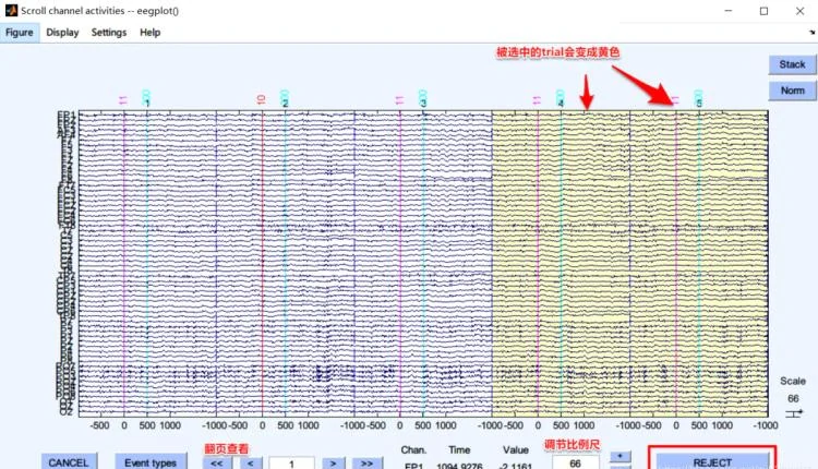 逐个trial进行查看,如果发现有伪迹过大的trial想要剔除的话,单击该trial,它会变成黄色。选择完所有trials后,点击下方的reject即可。此处选中的两个trials仅仅作为演示用。