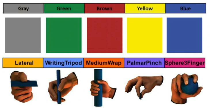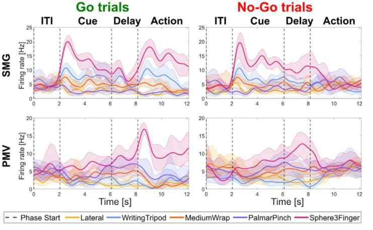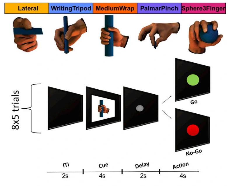 实验任务:通过从“人类抓取数据库”中获取的视觉图像,提示五种不同的抓取任务,以检查SMG、PMV和S1中与想象抓取相关的神经活动。