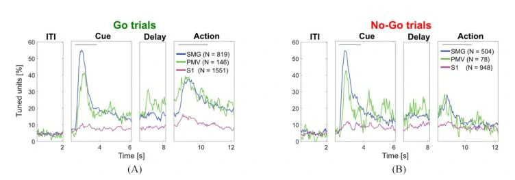 Go实验和No-Go实验测试过程中ITI、提示阶段和动作阶段窗口中每个抓握调优的单位的堆叠百分比分别如图4(A),图4(B)所示。