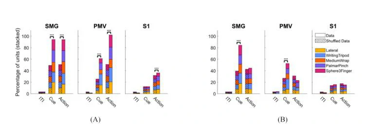 图4 ITI、提示阶段和动作阶段窗口中每个抓握调优的单位的堆叠百分比