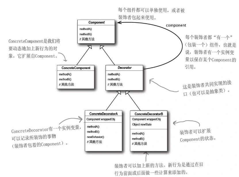 这里可以举一个生活中的例子,一个蛋糕,在蛋糕上摆上水果,这个蛋糕就变成了水果蛋糕,给这个水果蛋糕插上蜡烛,它就变成了一个生日蛋糕。(这是Head First中的一个例子,个人觉得非常的形象,记忆犹新)。