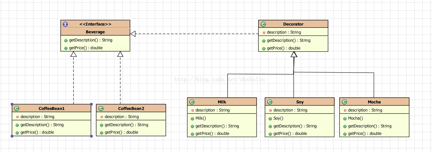 这里咖啡豆就是被装饰的对象,也就是图示中的ConcreteComponent,饮品类就是我们抽象出的Component,定义了展示价格和材料两个方法。牛奶、蜂蜜、摩卡是装饰对象,也就是图中的ConcreteDecoratorA、ConcreteDecoratorB。他们抽象出的Decorator,同样定义了展示价格和材料两个方法,具体类图与实现如下: