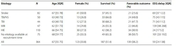 作者表明,将创伤性和非创伤性非血管神经外科诊断进行分组的原因是在这两类中都存在脑损伤和可能的颅骨缺损(导致脑电图中出现节律缺口)。并且,由于作者对创伤性脑损伤危重患者的预后预测特别感兴趣,在研究中也加入了“纯”创伤性TBI患者亚组(上述TBI/NS亚组的一个子集)。