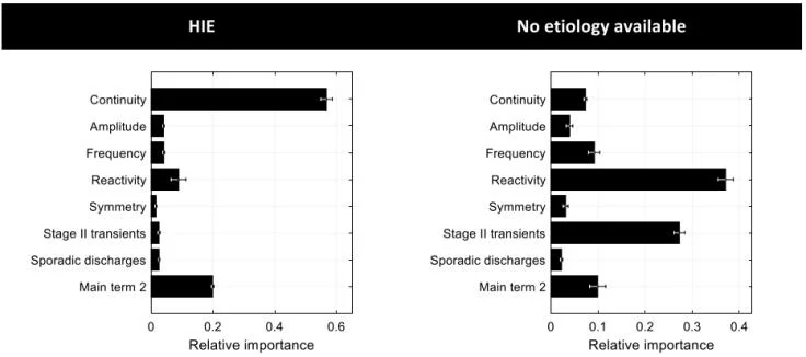 不同病因组中不同脑电图特征对预测生存率的重要性存在差异,如图1所示。而图2则显示了不同脑电图特征对预测患者利好结果的相对重要性。值得注意的是,脑电图背景反应性仅在TBI/神经外科患者亚组以及病因不明的亚组患者亚组中是最重要的特征。