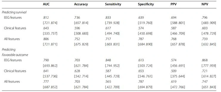 实验采用患者的脑电图特征(EEG features)和临床特征(Clinical features)来预测其生存率(Survival)以及利好结果(Favorable outcome)。