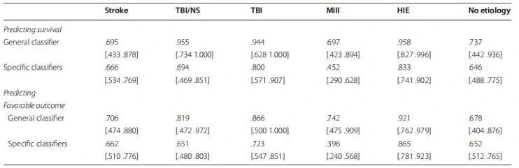 对于特殊分类器,实验仅根据脑电图特征对患者进行预测并使用四倍交叉验证,对具有相关病因类别的患者亚组进行独立训练。如下表结果所示,对于来自同一病因的患者,无论是预测患者生存率还是利好结果,特殊分类器的性能表现都低于一般分类器。