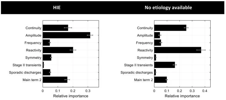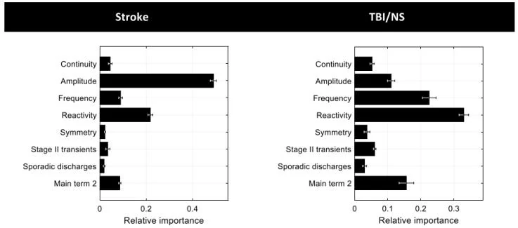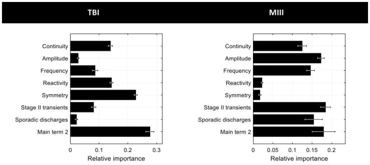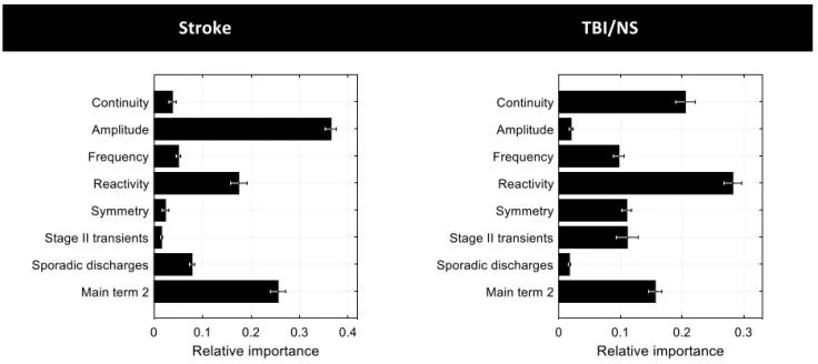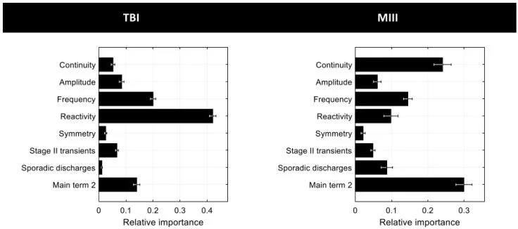 同时,作者提到,在对所有病因的患者数据训练中,分类器对HIE患者亚组的预测表现特别好,这是在预期之内的,因为EEG是HIE患者预后预测的重要常规工具。但分类器对TBI患者的预测效果也同样很好,这表明EEG在TBI 患者的预后中是具有潜在作用的,尽管此前脑电图并不是TBI患者预后预测的常规工具。当综合考虑所有患者时,脑电图背景反应性是最重要的脑电图特征,无论是预测患者的生存率还是利好结果。