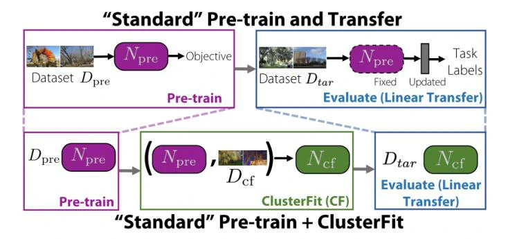 如图所示,ClusterFit的实现流程可概括为:①首先,给定一个卷积神经网络N_pre,该网络先在预训练数据集D_pre上做分类任务,因此N_pre具有一定的特征提取能力。②第二步,让预训练过的N_pre在目标数据集D_cf上采用K-means聚类算法,将数据集划分成K个groups,将groups所代表的聚类标签作为原始图像的伪标签。③从头开始初始化一个新的卷积神经网络N_cf,让其在D_cf上做伪监督分类任务,此处采用的伪监督信号L_cf即为前文中由N_pre所提供的聚类标签,由于N_cf在训练过程中未使用D_cf的原始标签,所以该方法可认为是无监督的,损失计算方法采用交叉熵损失。④在N_cf和N_pre尾部均加上一层线性层,在目标数据集D_tar进行线性验证,检验两种方法所学特征的泛化能力。