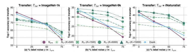 基本实验设置:设置N_pre和N_cf均为ResNet50,D_pre和D_cf均为Imagenet-1K,图中的横坐标p代表在N_pre预训练过程中加入多少百分比的噪声标签,对应每一个百分比,作者都训练出一个与N_pre相对应的N_cf,最后再用N_cf在三个数据集(Imagenet-1K,Imagenet-9K,iNaturalist)上验证N_pre的泛化能力。