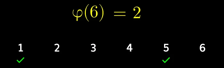 我们会发现在小于等于6的正整数中,只有1、5和数字6除了1以外并不存在其它的公约数,所以φ(6)=2