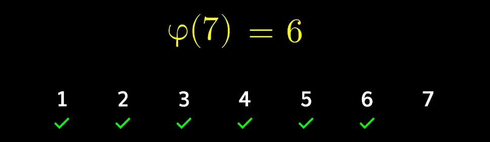 但是,如果n本身就是一个质数,情况就有所不同了,比如对于质数7来说,小于等于7并与7互质的数有1~6,除了7本身,因此φ(7)=6