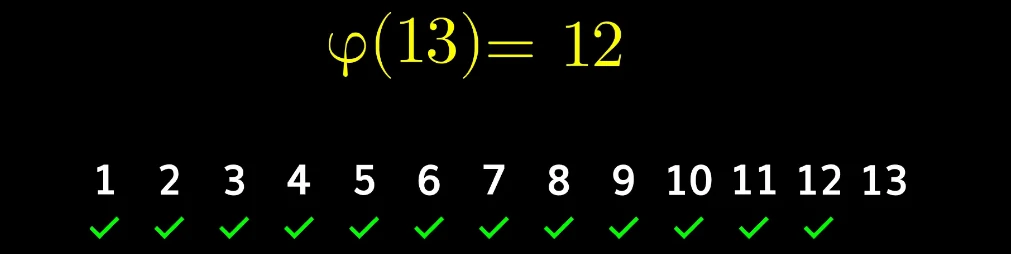 同理对于质数13来说,与13互质的数除了13本身其它全部都是,因此φ(13)=12
