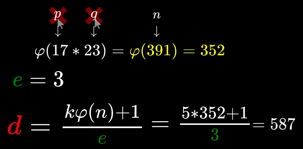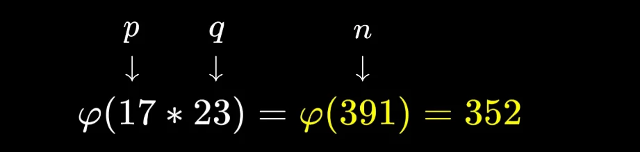 例如,我们可以选取两个质数17和23,因此我们可以轻易求得φ(391)=352