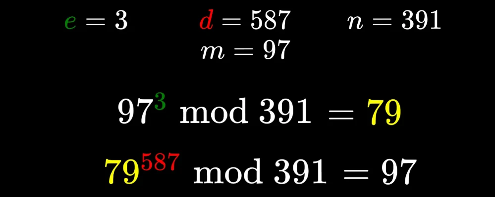 接着我们用求得的e、d、n来模拟一段信息的加密解密过程,我们要加密的字符是“a”,它所对应的ascII编码是97,于是97的三次方除以391并取余数等于79,79是我们加密后的密文,为了解密,我们计算79的587次方除以391取余数,得到原始数据97,因此成功还原了字符“a”