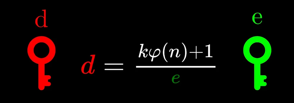 在求出了私钥d以后,我们将不再需要这里的p和q了,算法会将e和n公布,作为加密时用的公钥(public key),而d将保存下来作为解密时用的私钥(private key),其他人由于不知道p和q这两个关键的质因数,没有办法计算出这里的φ(n),因而无从破译这里的私钥d